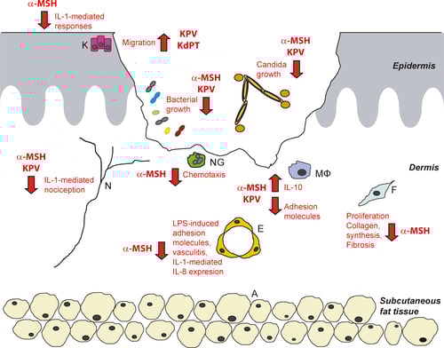 An overview of the effects of KPV (and other alpha-MSH derivatives) in the process of wound healing.